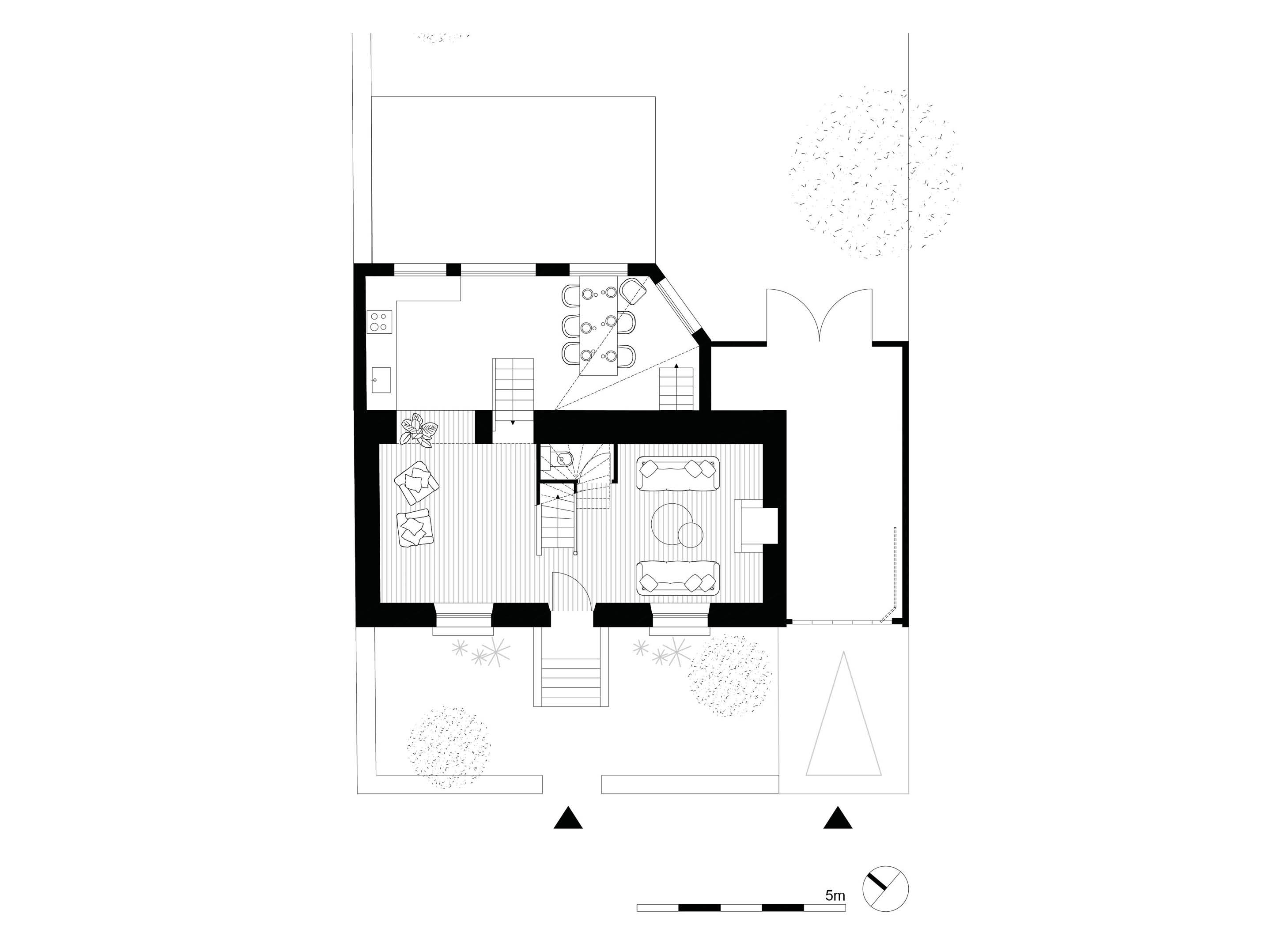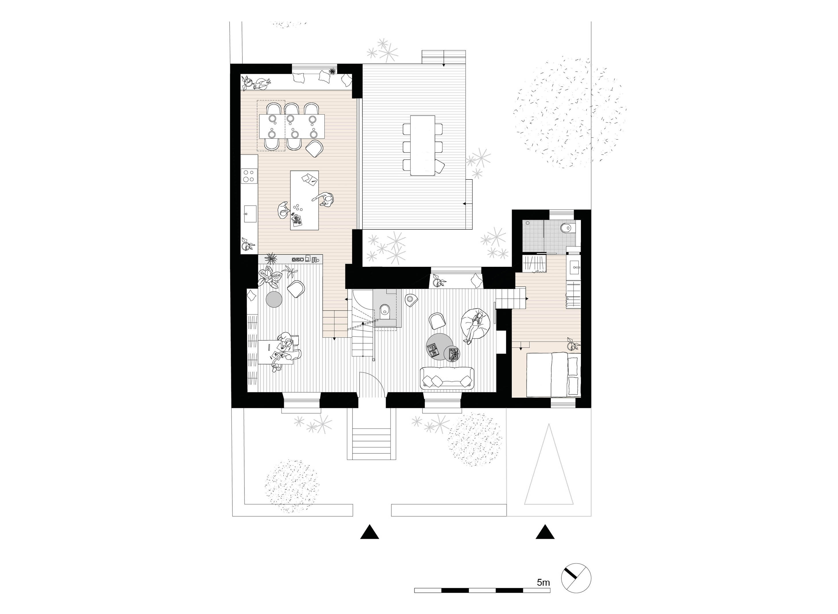L’extension au rez-de-chaussée, côté jardin, ouvre largement la maison sur une terrasse généreuse. Le demi niveau existant devient une ressource. Il permet d’intégrer le plan de travail de la cuisine à l’articulation des espaces. Véritable “pivot” entre l’existant et l’extension, cet élément structure la circulation, les vues et la lumière, tout en affirmant la singularité du projet. Les volumes offrent à la fois des espaces communs lumineux et des recoins propices à l’intimité.